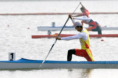 10月26日,山东选手梁福岩(前)在比赛中奋力划行。当日,在第十一届全运会男子单人划艇1000米决赛中,梁福岩以4分02秒497的成绩夺冠。 新华社记者朱峥摄