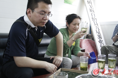 山东爱心企业代表不乏懂茶之人,图为山东省体育彩票管理中心何珊(女)和中国农业银行山东分行题召栋在茶企工厂品鉴北川茶