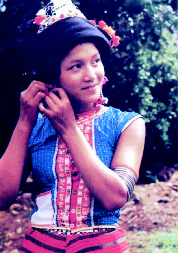 布朗族妇女一般都头挽发髻,发髻通常戴各种饰品,尤其喜欢别一枚叫“戛丝戛中”的银簪,银簪上有精美的“三尾螺”图案。有些妇女平常包头,其式样是用白布帕巾缠绕成三尾螺的样子。布朗族妇女与三尾螺的关系,是缘于一段美丽的传说,人们为了纪念美丽的姑娘亿英,便把铸有三尾螺图案的银簪别在发髻上,期望她的遭遇和不幸永远不再出现,幸福美满的婚姻能降临在每个普通人身上。
