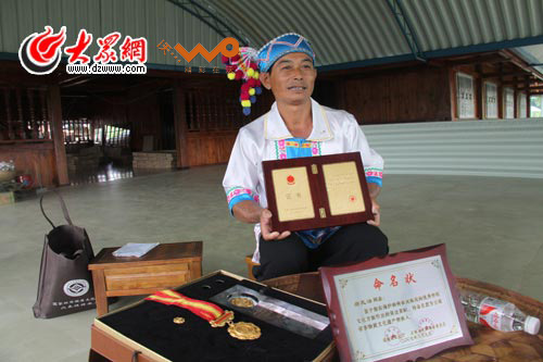 岩瓦洛手中拿的是国家颁发给他的布朗族弹唱非文化遗产传承人的证书,这个证书让他感到自己的责任重大。