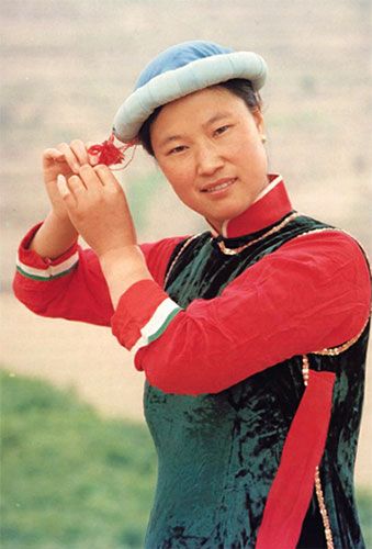 青年妇女头戴黑色“昂处”(一种帽子),其特点是帽子的后面留有一个束口,帽沿上穿着一根丝线,丝线两头挽有丝穗,戴上帽子,束好束口,然后再把穗子别在两鬓。
