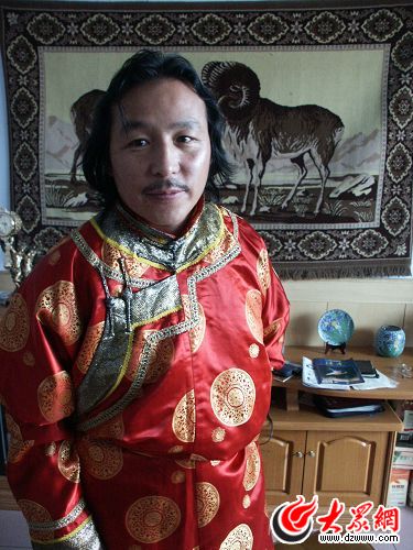 9年前的合影。虽然搬进了楼房,但处处能嗅到草原的气息:一幅硕大的羊毛挂毯占据着大半面墙壁,图案是草原、羊群、马、毡包。铁穆尔身材彪悍,留着长发,一幅西北游牧汉子的形象。