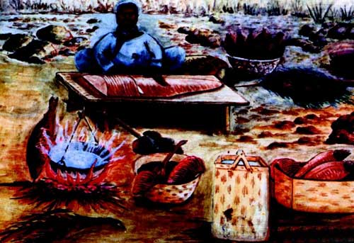 做饭(风俗画) 作者:尤勇贤(1912— ) 赫哲族农民画家
