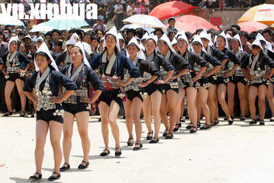 一群哈尼族奕车姑娘在“姑娘节”上进行舞蹈表演。