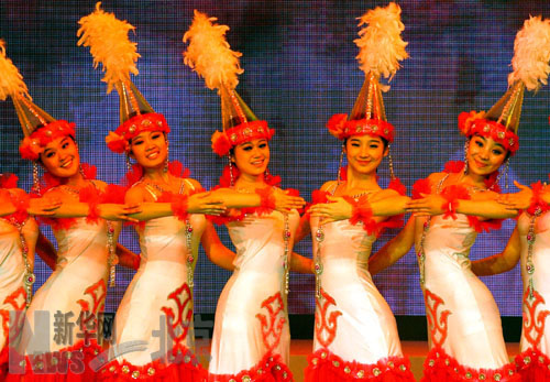 中央民族歌舞团在北京大红门国际服装节和谐华夏民族服装展演会上表演哈萨克族女子舞蹈。 新华社记者王呈选摄