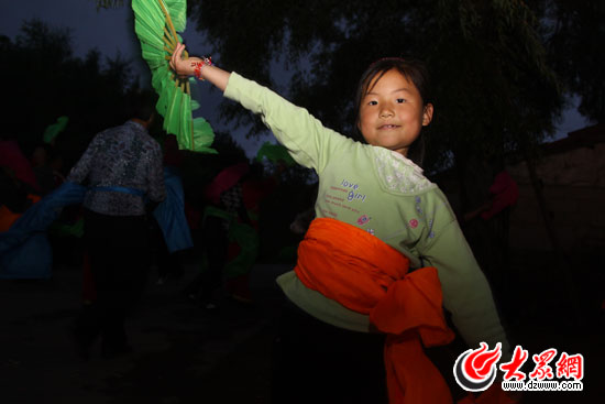 黄岭村8岁的小朋友石雅轩在表演东北大秧歌。