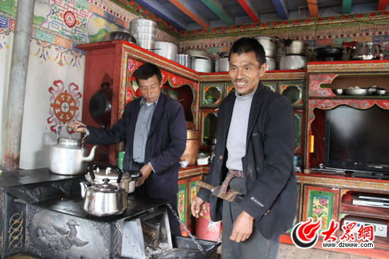 采访团被邀请到多布登家中做客,多布登和弟弟巴鲁(右)正给大家做午饭。