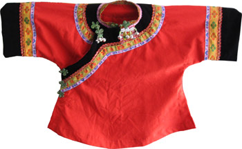 水族女服多以水家布缝制,无领大襟半长衫或长衫。长衫过膝,一般不绣花边。而节日和婚嫁盛装与平时截然不同。婚礼服上装的肩部一圈及袖口,裤子膝弯处皆镶有刺绣花带,包头巾上也有色彩缤纷的图案。头戴银冠,颈戴银项圈,腕戴银手镯,胸佩银雅领,耳垂银耳环,脚穿绣花鞋。新娘子往往被打扮的花枝招展,风采翩翩。此外妇女刺绣的背带更有艺术性。说是"带",实际上是一块刺绣华丽的"T "形"帘子",上端两边有带,"帘子"的大小可包住幼儿。它是将白色马尾缠绕上白丝线,再加上其它彩色丝线,先把各种图案分别刺绣好,最后将绣好的图案拼镶到背带布料上做成的。背带美观实用,是母亲对出嫁女儿最好的礼品。