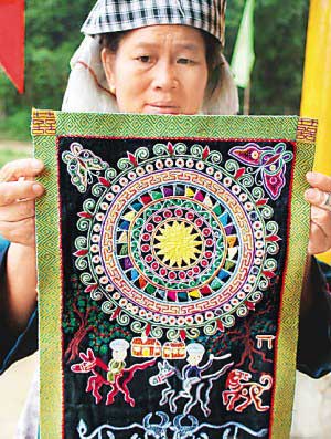 第五步,订“金钱”。在绣品上订上闪亮的小铜片以增加绣品亮度;