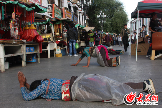 [提要] 虔诚的藏传佛教信徒磕长头。