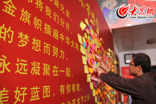 山东黄金集团艺术节畅想展板前,员工在将自己的畅想小贴纸粘贴在展板上,组成一个“心”