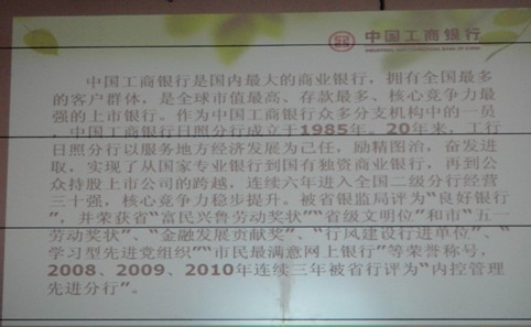 上午11点,到日照工行市行体验方便、优惠,随时随地都可以交费的“网上缴费”业务,并通过召开座谈会,听取银行理财经理讲解工行金融理财服务,让我们全方位了解了网上银行的安全、方便,知道根据个人情况怎样去理财。