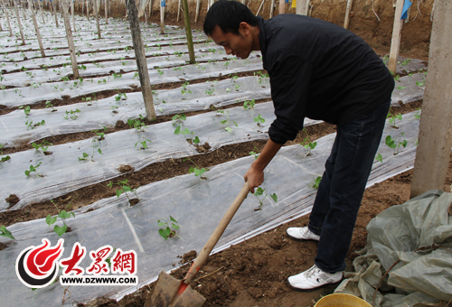 记者学着种植户,铲来泥土盖住保温膜边缘