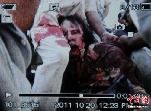 利比亚“全国过渡委员会”武装20日称在苏尔特已经俘获了卡扎菲。据利比亚过渡委武装一名官员称,被俘的卡扎菲双腿受伤。图为“过渡委”官员公布的卡扎菲被俘照片。