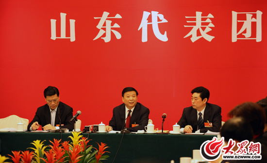 全国人大代表、山东省委副书记、省长姜大明现场回答记者的提问。