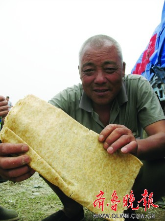 就是在那个几千人的安置点,记者第一次见到了他们。在那辆写着歪歪扭扭的“山东莒县农民救灾志愿者”的三轮车旁,他们正在守着半袋子长了毛的煎饼,既不敢吃又舍不得扔掉。