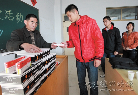 “百万爱心笔”活动现场,史运仓在向学生发放爱心笔。记者 刘振兴 摄