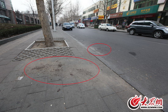 记者沿事发地点向东步行,发现此路段正位于山东农业大学后门附近,从撞车地点到歹徒就擒地点约有600米的路程。记者在擒获歹徒现场注意到,摊点地面上仍散落着车辆撞击留下的玻璃碎片,擒获现场路面上的两大片血迹已被沙土掩埋。