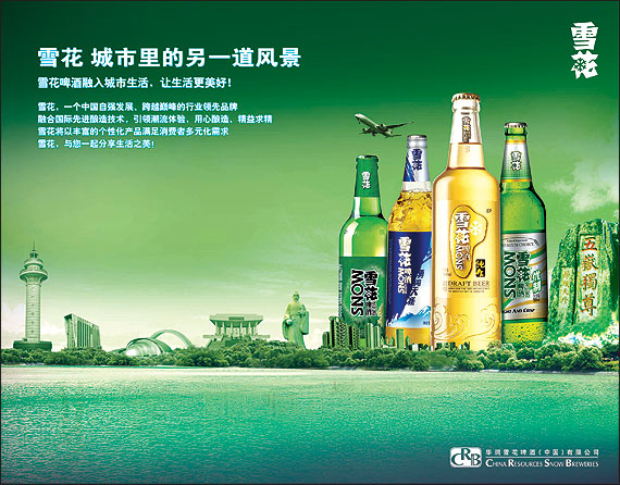 华润雪花啤酒(中国)有限公司成立于1994年,是一家生产、经营啤酒的全国性的专业啤酒公司。总部设于中国北京。其股东是华润创业有限公司和全球第二大啤酒集团SABMiller。目前华润雪花啤酒在中国经营超过70家啤酒厂,旗下含雪花啤酒品牌及30多个区域品牌共占有中国啤酒市场的21%份额。2010年华润雪花啤酒销量超过928万千升,年增长达11%,公司总产销量连续六年遥遥领先国内其他啤酒企业。2010年雪花单品牌销量进一步增长16%达到843.1万千升,巩固了其作为全球领先啤酒品牌的地位。