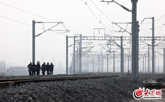 2月8日接近中午12点,初春暖阳下寒风依旧料峭。一群头戴皮帽、身穿蓝色工作服的铁路工人冒寒在京沪高铁西客站铁道工地上干得起劲儿。此时,胡克俊副段长与姚志刚队长正在道轨上向中铁电气化局项目经理汇报工程进展情况 。因为他们要提前完成工程,保障京沪高铁济南段西客站本月18日前能够送电。