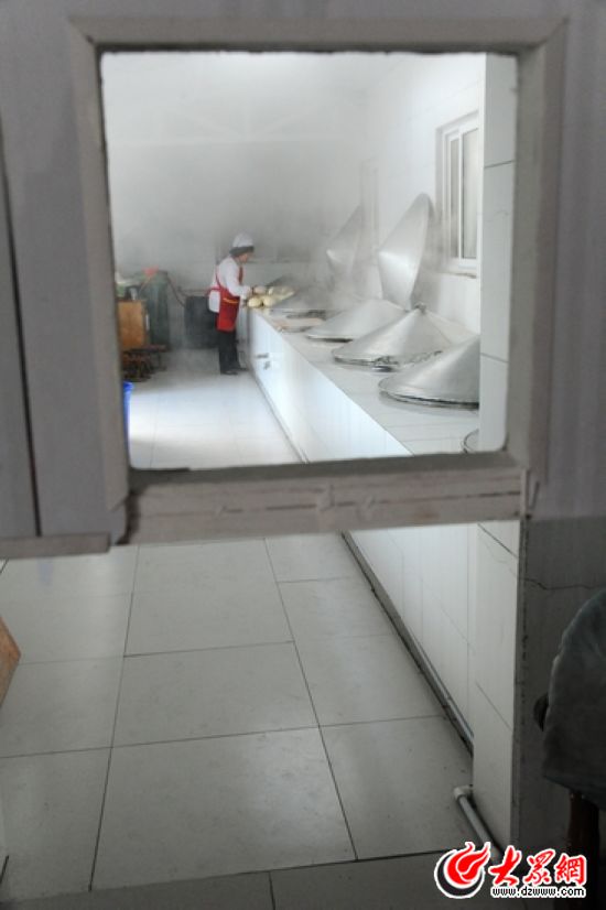 二次发酵车间,正好将生熟两个生产车间隔开。为了保证食品卫生,在两个区的隔离墙上,只留下一个可以通过馒头的专用通道,人是不能随便穿行的。记者从绕行到熟馒头区,只见8口大铁锅并排在一起,一位妇女正在往大锅里面放生馒头。一个大铁锅可以放18个大馒头,按照每个1斤算起来,这一锅就足有18斤。