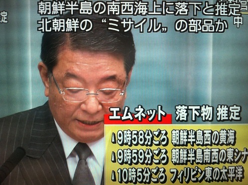 据藤村修官房长官介绍,朝鲜方面今天上午9点45分发射导弹,10点1分途径日本冲绳县上方。日本全国瞬时警报系统“J警报”立即启动。火箭的第一段于9点58分降落在朝鲜半岛黄海海域,第二段降落在朝鲜半岛西南方向的东海海域。导弹最终于10点5分降落到菲律宾东部300公里太平洋海域。所有零件都降落在事先预告区域。