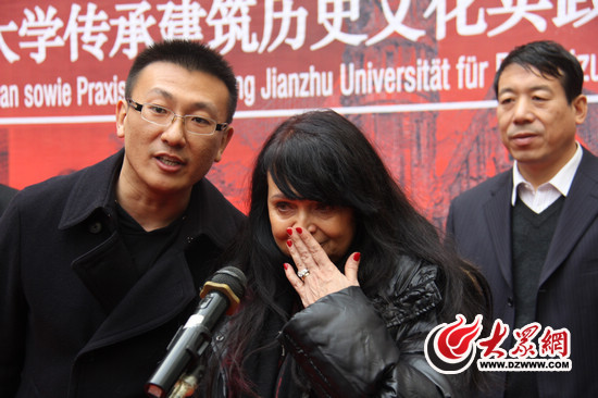 今天上午,济南老火车站设计者的孙女西维亚夫妇来到山东建筑大学图书馆,参加“菲舍尔与济南老火车站暨山东建筑大学传承建筑历史文化实践”图片展。在发言最后,当西维亚用汉语说出“谢谢”时,她被现场观众的热情感动得再次落泪。