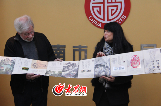 西维亚夫妇收到济南档案局赠送的礼物——一幅泉城画卷。