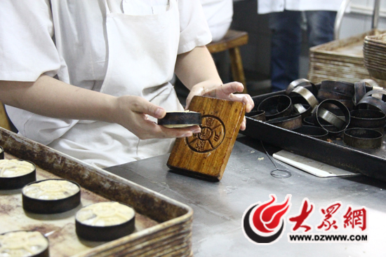 除了馅料制作之外,整个车间同时采用了纯手工和机器两种方法进行月饼的包制。车间的负责人告诉记者,济南当地风味的“葡萄软月”月饼现在依旧采用人工包馅,木质磨具成型的方法进行制作,而广式月饼则已采用机械化流水生产。“手工包是为了体现济南月饼的老风味,每个月饼都控制在100克左右。手工虽然比不上机器快、规整,但却是一种文化的体现。”