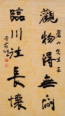 尽管李方玉几十年来收藏这些名家书画花了很大工夫,但捐献给家乡,一能使这些作品让更多的人欣赏学习,使其在弘扬中华文化中发挥一定的作用;二是报答故土的养育之恩,算是为家乡人民献上的一份爱心。这使我想起了孔夫子的“志于道,据于德,依于仁、游于艺”的名言,感悟到了李方玉先生立志高远、关爱社会的人生境界。(附图为李方玉捐献的于右任对联)