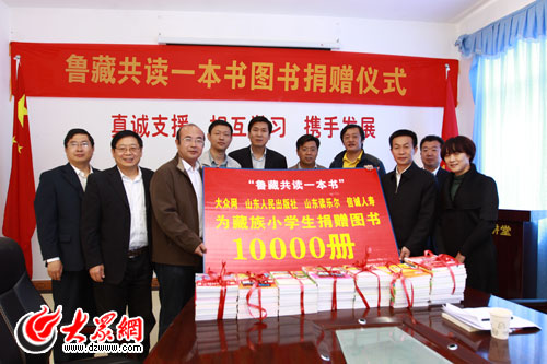 “鲁藏共读一本书”日喀则爱心读书活动由山东援藏干部中心管理组和大众网联合发起,山东人民出版社、山东读乐尔图书公司提供图书,信诚人寿山东省分公司、渤海银行济南分行等单位提供爱心支持。这些图书将陆续捐赠给日喀则地区小学,以让西藏小学生能与山东省小学生一起共享书籍带来的智慧和财富,激发读书热情,营造读书氛围,学习广博文化知识,坚定理想信念,塑造优秀品格。2010年9月,“鲁藏共读一本书”爱心读书活动在山东省启动,大众网为革命老区、山东临沂市费县刘庄镇中心小学捐赠精品图书5000册,受到当地政府的高度评价和师生的热烈欢迎。