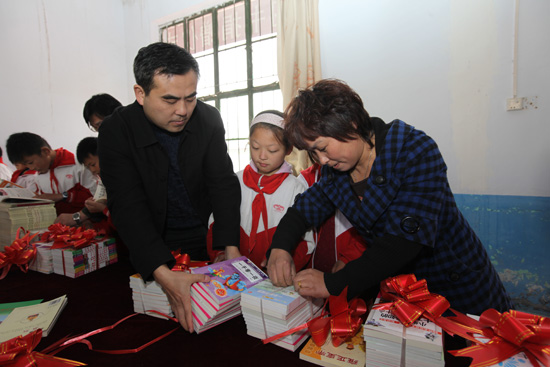 大众网副总编辑姜长勇向明德小学学生捐赠爱心书籍。(曹亮 摄)