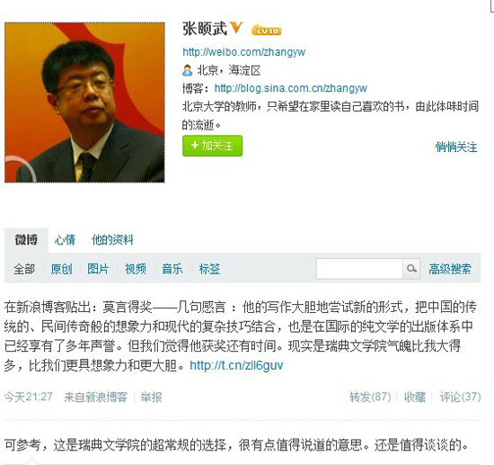 在个人实名认证微博中,张颐武说,莫言的写作大胆地尝试新的形式,把中国的传统的、民间传奇般的想象力和现代的复杂技巧结合,也是在国际的纯文学的出版体系中已经享有了多年声誉。