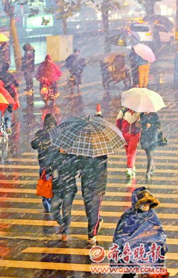 13日入夜时分,省城街头,片片雪花在风中飞舞,行人冒雪匆匆赶路。13日,济南市教育部门下发紧急通知,14日中午前后如出现雨雪天气,学校可自行决定放学时间,也可决定下午是否到校上课,尤其是小学生。记者了解到,13日下午放学时,由于正在降雨,济南市东方双语实验学校东校区破例让家长进教室接孩子。