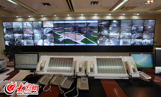 安全生产指挥中心内巨大的显示屏可以监视井下及厂区内各处的情况。(盛堃 摄影)