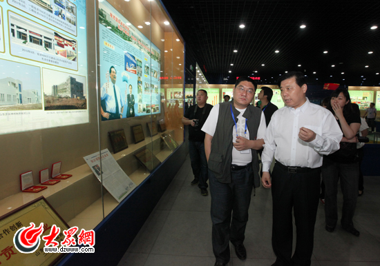 菏泽市委常委、宣传部长王永江(右)和大众网总编辑朱德泉(左)一同参观山东步长制药有限公司。(盛堃 摄影)