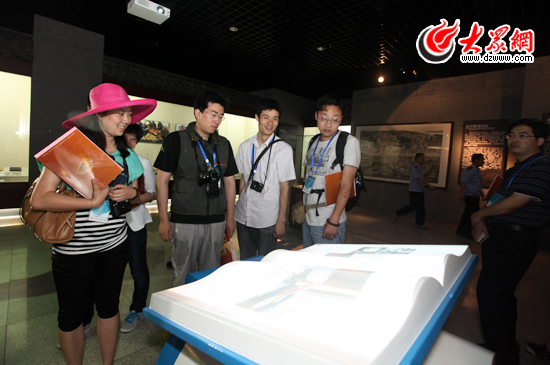 展馆内的“电子书”让采访团记者更直观了解聊城市的运河文化。(盛堃 摄影)