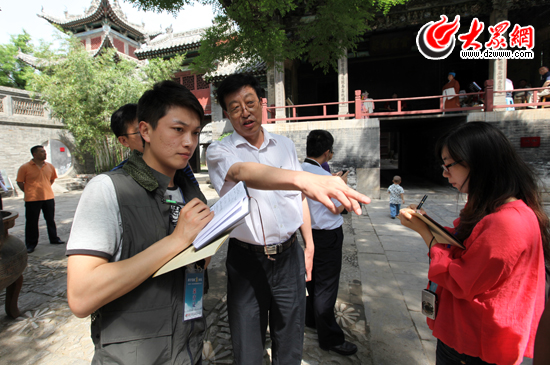 聊城市委常委、宣传部长赵庆忠(中)向记者介绍山陕会馆的历史。(盛堃 摄影)