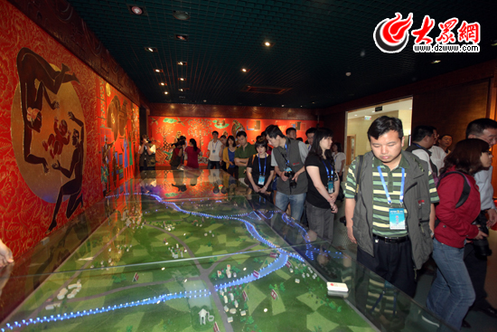 采访团记者参观采访中国阿胶博物馆内的阿胶水源模型。(盛堃 摄影)