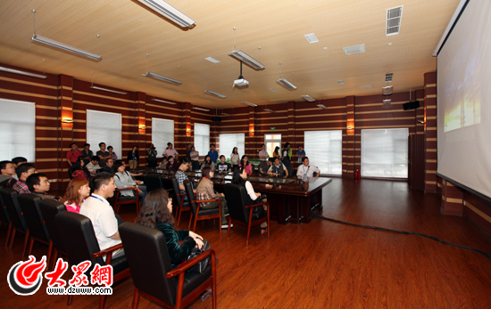 采访团领导、记者一同观看中德生态园宣传片。(盛堃 摄影)