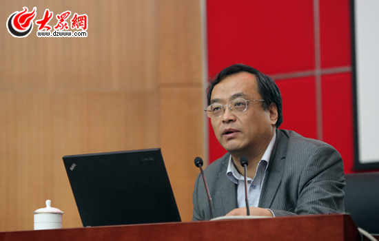 西海岸经济区规划部负责人王波向采访团介绍西海岸经济区的相关情况。(盛堃 摄影)