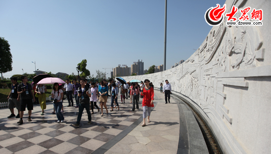 采访团记者参观采访东湖公园内的文化墙。(盛堃 摄影)