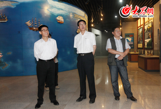 聊城市委常委、宣传部长赵庆忠(中),大众报业集团党委常委、副总编辑郝克远,大众网总编辑朱德泉一同参观中国运河文化博物馆。(盛堃 摄影)