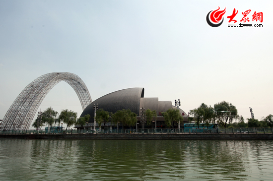 沿着波光粼粼的东昌湖南岸一路向东行进,下午17时左右,记者便来到了这个座落在湖南岸的水城明珠大剧场。和它的名字一样,远远望去,圆形的剧场像是一颗正要从湖水中升起来的明珠,让人误以为它一半在空中,一般在水里。