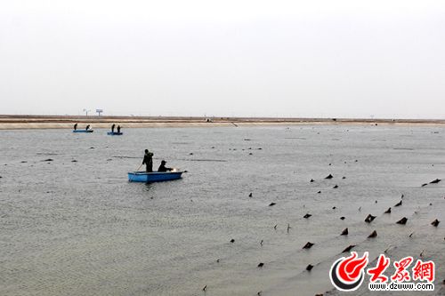 每个海参池的池深在一米半以上,上午正好赶上不少养殖户正在进行捕捞作业。(马鑫 摄)
