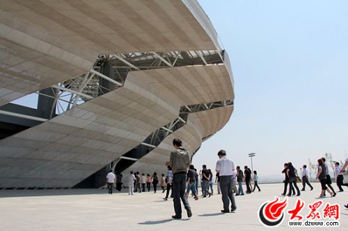 在离文登市体育公园还有几百米的时候,记者们就对着前方的银白色圆形建筑物发出感叹:“快看!那个建筑真漂亮!”文登市城乡建设局的孙丹丹笑着告诉大家,这座建筑就是文登市体育公园,而它的设计单位就是奥运场馆“鸟巢”的中方设计单位——中国建筑设计院设计的。