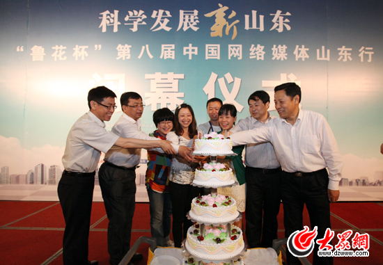 “7天来,大家废寝忘食,夜以继日,挑灯夜战,用手中的键盘、眼前的镜头,记录下山东科学发展的亮点和经验。此时此刻,我想,在座的很多人可能都在回忆7天来的那些伙伴、那些城市、那些令你动情的每个瞬间……今晚,作为‘网络媒体山东行’一直以来的承办单位,大众网向参与此次活动的一些朋友送上一份惊喜。”今晚,随着大众网总编辑助理、采访中心主任李冉一席话,现场顿时熄灯,一个四层高的生日蛋糕被推了上来。伴随着熟悉的生日快乐歌,现场的嘘声、掌声响成一片。“今天,我们为在媒体行当月出生的朋友们,送上生日的祝福,请他们上场。”随着主持人的话语,人民网山东分公司新闻编辑聂俊穹、广西互联网信息办公室雷蕾、每日甘肃的记者葛鹏和大众网采访中心见习记者张帆纷纷走到舞台上。
