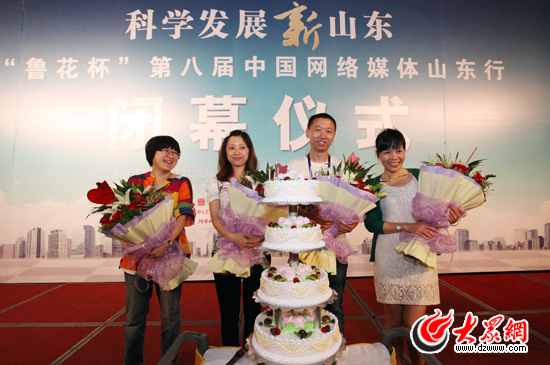 科学发展新山东——“鲁花杯”第八届网络媒体山东行闭幕仪式上,主办方为5月份过生日的采访团成员庆生。(盛堃 摄影)