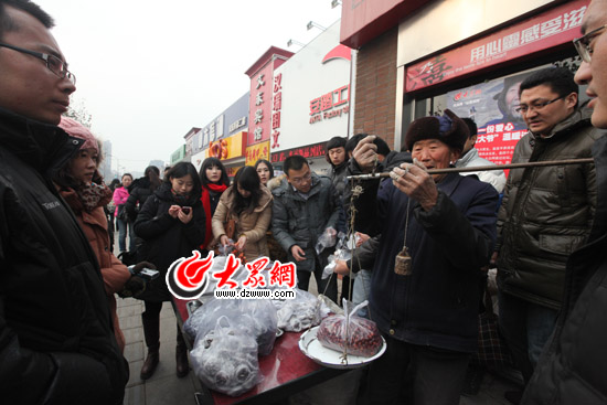在文化东路六乃喜快餐店门口,大爷的摊子刚刚摆上,就被过路的行人和特意前来的网友围住了,大家纷纷上前购买“绿色山货”,大众网的五六位记者不断地帮着大爷装袋、收钱,过称……尽管今天的气温很低,但大家不一会儿就忙出一身汗来。