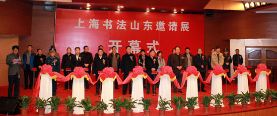 11月27日上午,在举国上下欢庆党的十八大胜利召开的大好形势下,上海书法山东邀请展在山东省图书馆隆重开幕。出席开幕式的上海书法家代表团成员有:上海书协副主席、副秘书长李静,上海书协副主席张淳、张伟生、丁申阳、宣家鑫,上海书协主席团委员黄仲达、郑振华,上海书协理事杨泰伟。